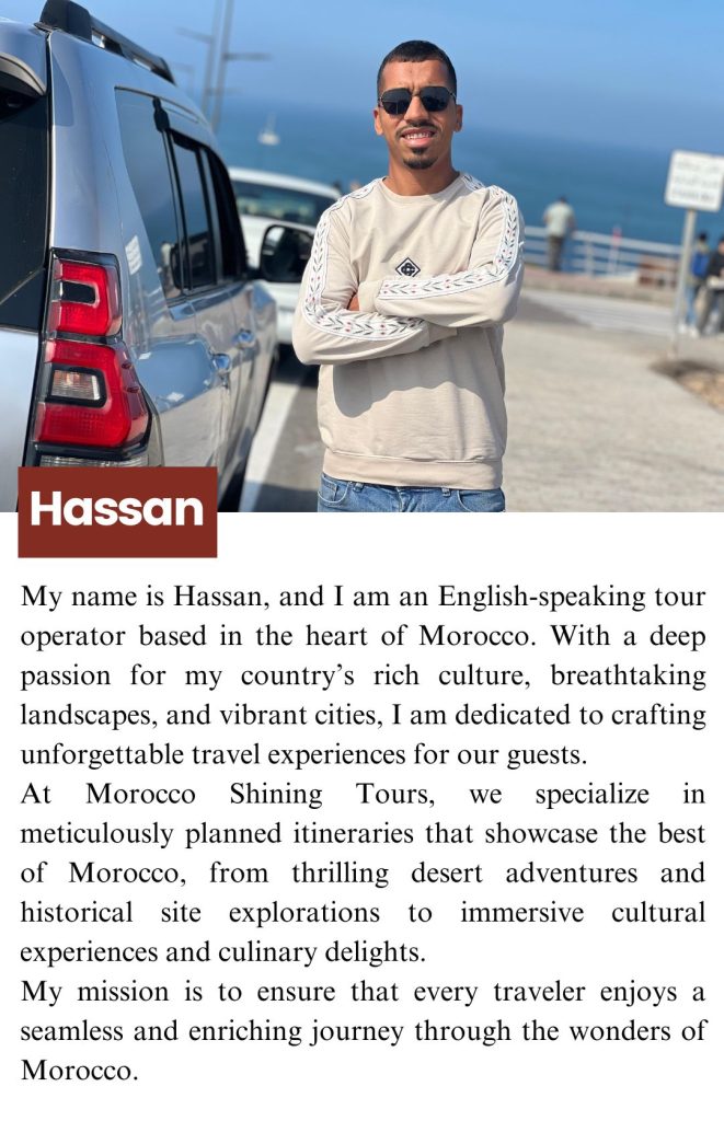 We are a nearby trip specialist Agent who offers you the best tweaked and guided Tours to explore Morocco such as Marrakech Tours, Fes Tours, Casablanca Tours, Agadir Tours, Ouarzazate Tours, Morocco Desert Tours to Erg Chebbi Merzouga Desert, or to Erg Chigaga Desert with camel treks for people and gatherings, likewise sorting out Excursions day or day trips…  We are helping tourists by praising the cordiality and culture of Morocco by having a noteworthy experience. We are resolved to surpass the desires of clients by conveying to them an unforgettable experience that they would appreciate for a lifetime. We are always engaged with charming the voyages for gathering the necessities and interests of our customers. Morocco Shining Tours is here to make your movement experience fun and straightforward.